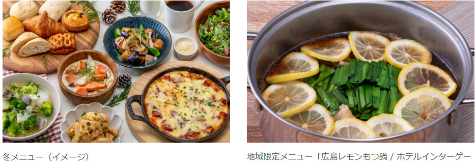 冬の寒さが厳しくなるこの季節に一日の始まりをおいしく、そして身体の中から温かくスタートしていただけるよう、旬の食材を取り入れたメニューを豊富にご用意いたしました。鶏肉の旨みとオレガノの風味が食欲をそそる「チキンとキャベツのトマトチーズ焼き」は、濃厚なトマトソースとチーズのコクが寒い朝にぴったりの満足感ある一品です。欧風スープ料理「鱈と野菜のズッパ仕立て」や、フィンランドの郷土料理をアレンジした「サーモンと冬野菜のミルクスープ仕立て(ロヒケイット風)」など心も身体も温まるスープメニューは、旬の恵みを凝縮したこの季節だけの特別な味わいです。また、地域限定メニューとして「広島レモンもつ鍋」など各地域の名産などを活かした「体が温まる料理」もご提供いたします。