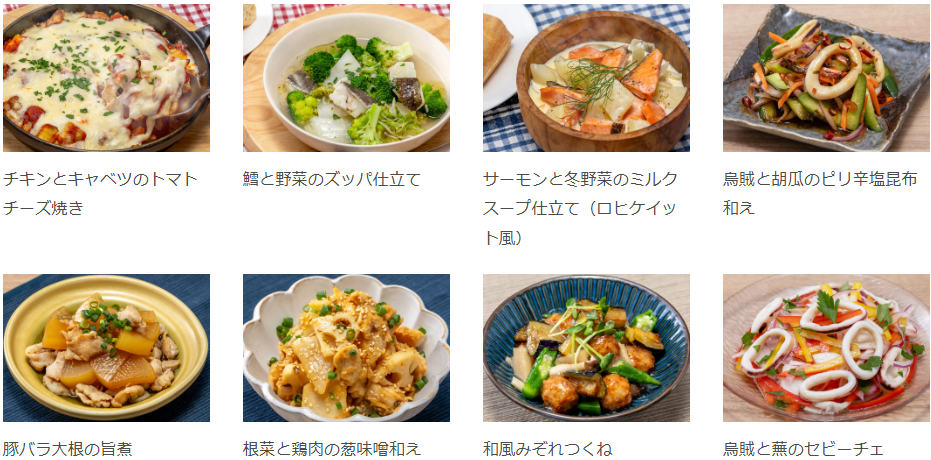 豚肉と白菜のエスニック風 / 蓮根と茸の粒マスタードマヨ和え / 春菊とベーコンのメランジェサラダ / 大根と豆苗のシーザーサラダ など