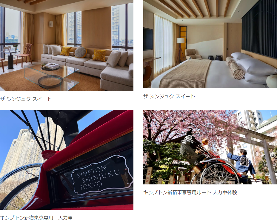2連泊以上の全ての客室に追加できる本プランには、延べ324万人以上が来館した東京・麻布台ヒルズにある「森ビルデジタルアートミュージアム:エプソンチームラボボーダレス」への入場チケット、キンプトン新宿東京限定ルートを人力車で巡る60分の周遊体験。さらに、チェックアウト後の都内エリアまでの片道送迎サービスが含まれます。また、ホテルに1室のみの最上級スイート「ザ シンジュクスイート(70㎡)」には本特典をあらかじめご用意しています。