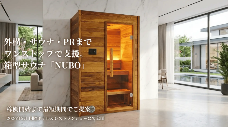 導入の窓口を一本化し、外構・サウナ・PRまで一気通貫で支援。箱型サウナ「NUBO」新発売と国産電気ストーブ「IRORI」をHCJ2026で初披露(西1ホール W1-Q25)