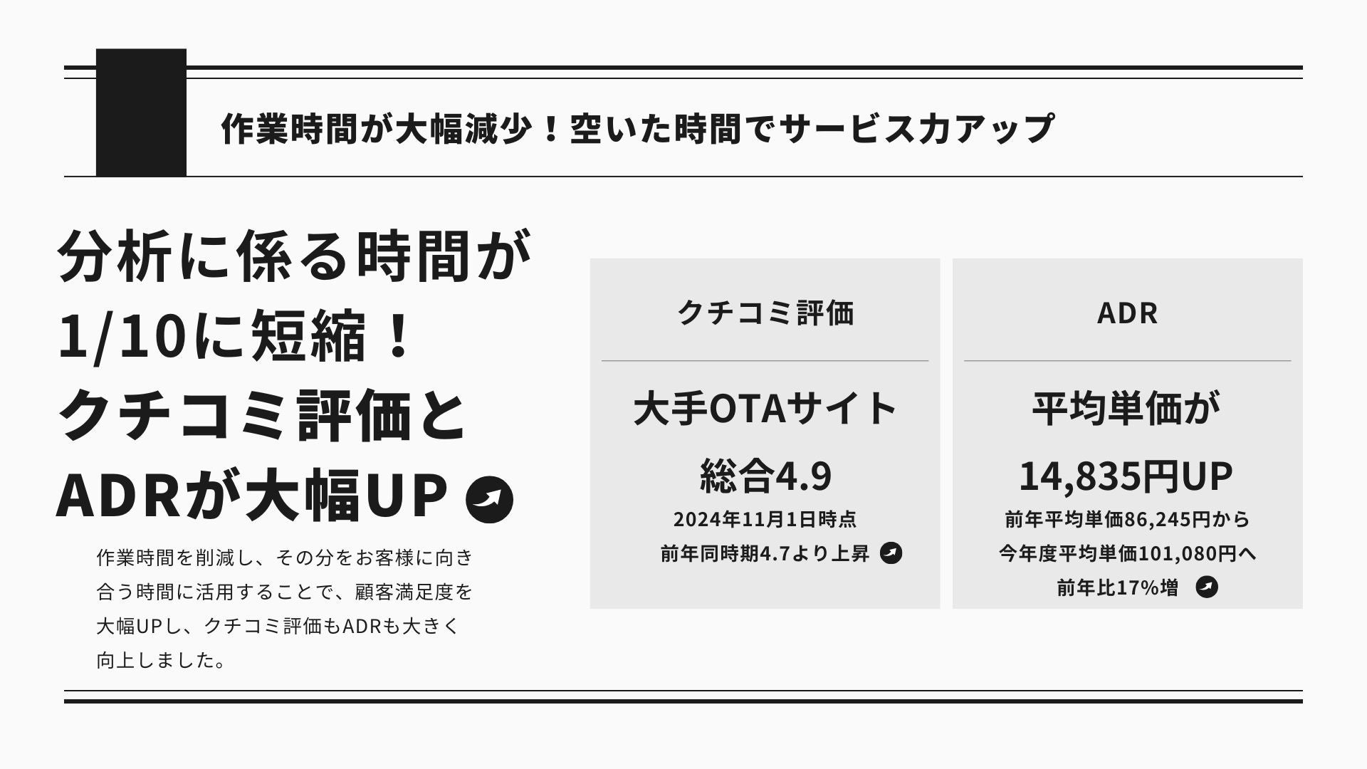 「自動でデータ収集&分析、出勤後すぐに確認できる」レベニューマネジメ ントに必要な時間を1/10以下に。空いた時間でさらなるサービスの追求を