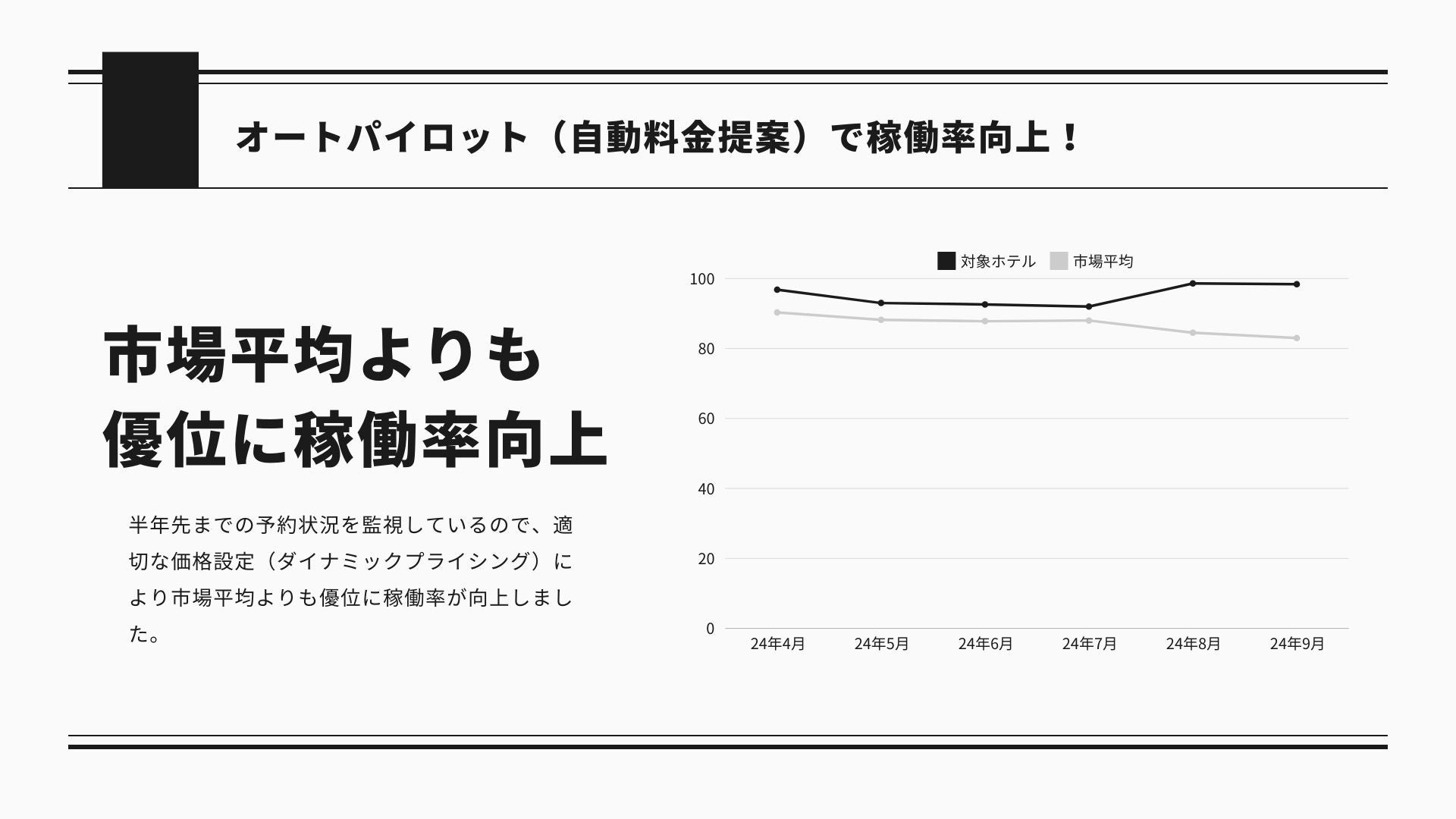 私たちのようなホテルでは、急なイベント情報の発表など、刻一刻と変化する宿泊需要を把握し続けることが重要です。ただ数ヶ月先の情報を即座に把握することは難しく、気づいたら在庫がなくなっているみたいなことも多くありました。『ANDPLUS』にはそんな需要の変化に自動で対応できる「オートパイロット機能」があり、それを活用することにより、スタッフが気づくよりも早く価格調整を行うことができました。他のレベニューマネジメントシステムでは単純に競合施設よりも料金を下げていくものや、意図しない極端な料金調整がされる場合もありましたが、ANDPLUSはあらかじめルールを設定することができ、コンサルタントによるフォローもあったので安心して任せることができました。 結果的に、オートパイロット活用以前よりも稼働率、平均販売価格ともに向上し、周りのホテルが苦戦をする中でも大きく売上を伸ばすことができました。