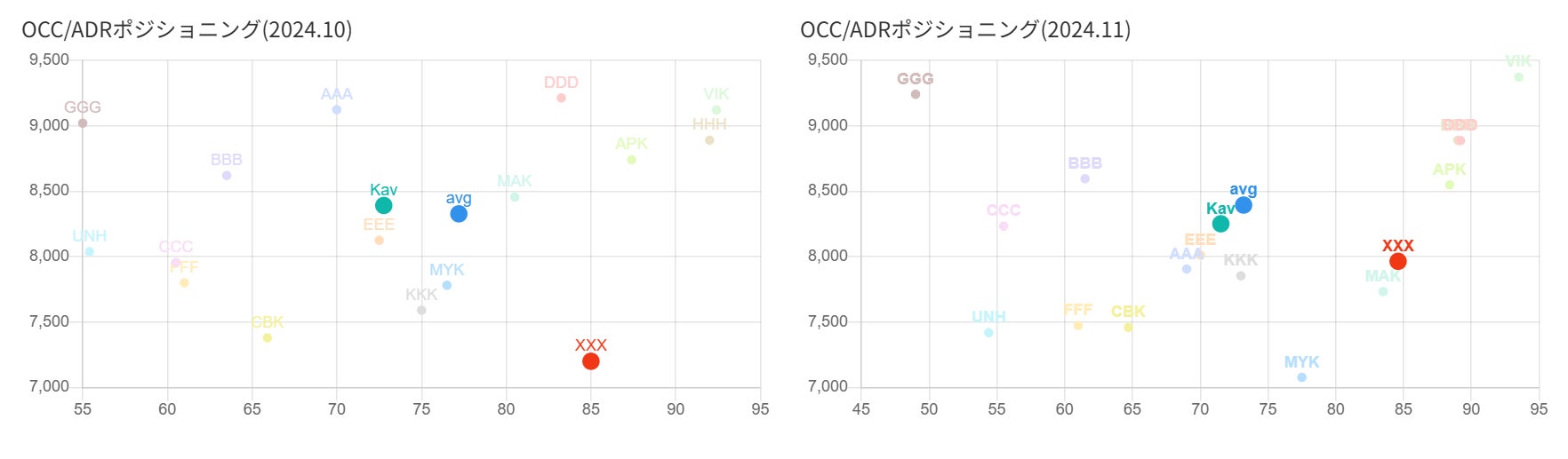 市場平均、競合平均、自社と競合施設のポジショニング分析が可能に。