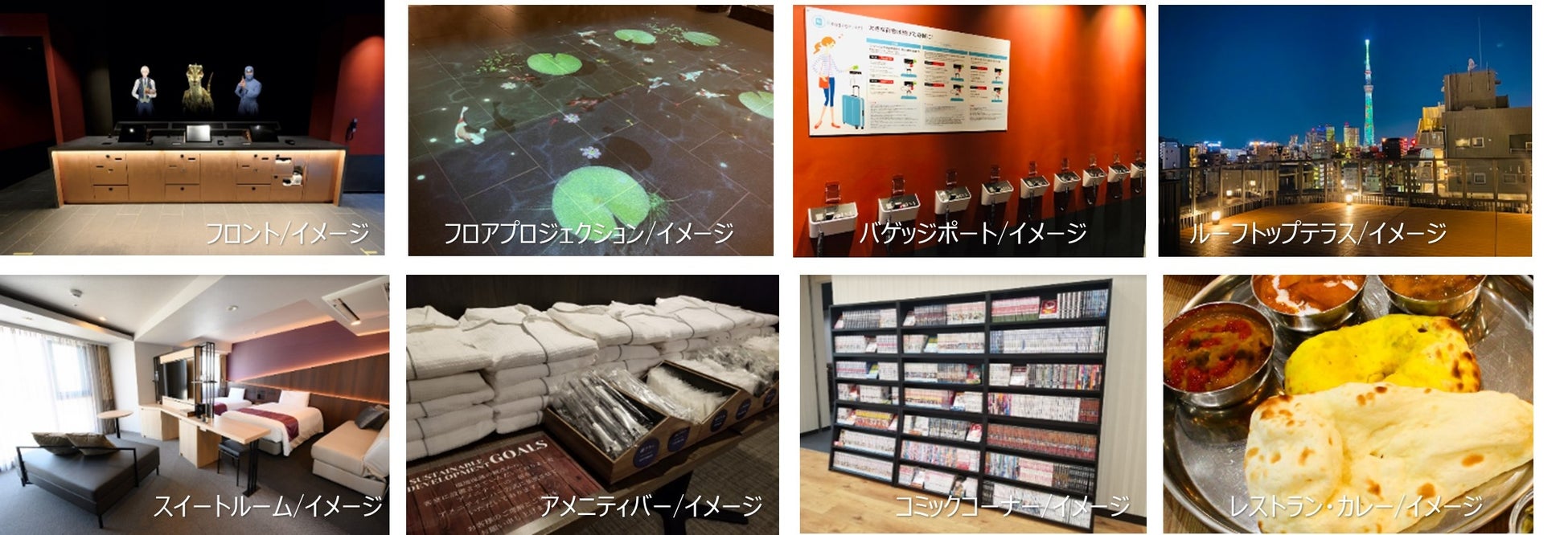 フロントには映像で映し出されたキャラクターがチェックインをお手伝いする‘光のホログラム‘を導入、コロナ禍でも安心の非対面チェックインです。ロビーではインタラクティブなフロアプロジェクションでお客様をお出迎え、お荷物のお預かりシステム‘バゲッジポート’もございます。ホテル最上階のルーフトップテラスからは東京スカイツリー®を一望いただけます。客室には、衣類の除菌・ニオイやしわをとるクリーニングマシンLGスタイラーや大画面テレビでスマートフォンのコンテンツを楽しめるクロームキャストを設置、コーナースイートルームを含む7タイプ全217室。ご滞在のお客様は無料でご利用いただける1000 冊のマンガを揃えたコミックコーナーも新設し、お客様から大変ご好評いただいております。また、今年 4 月より施行されたプラスチック資源循環促進法に対応し、アメニティ類を客室に常設するのをとりやめ、お客様に必要なものだけをお持ちいただく‘アメニティバー’を客室階各フロアに設置しております。ホテル1階にはコンビニエンスストアを併設、2階に和食・洋食・インド料理をご提供するレストラン‘Early Birds Dining 6.5’では和洋中・本格インドカレーなどの朝食ビュッフェ、焼きたてナンが食べ放題のインドカレービュッフェと豚丼のランチをご提供しております。浅草・雷門、かっぱ橋道具街などへ徒歩圏内で観光の拠点に大変便利な立地です。