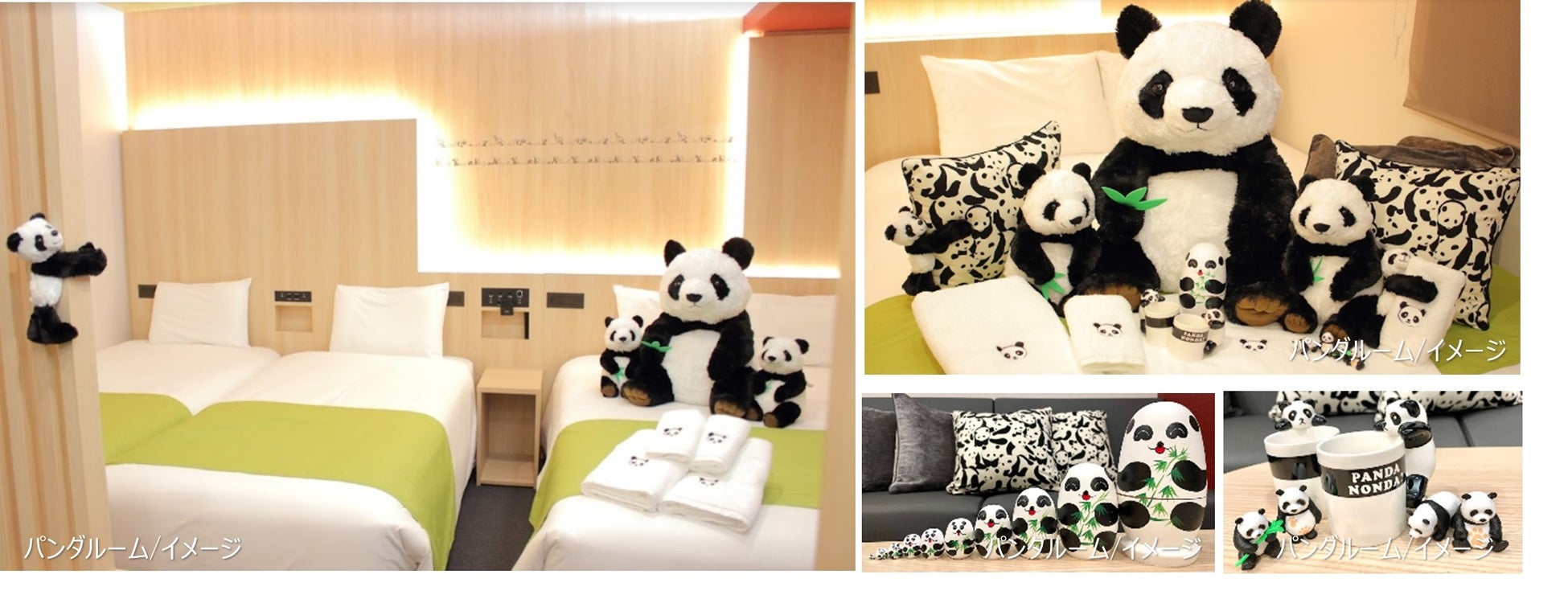 「変なホテル東京 浅草田原町」をご利用いただくお客様の多くは、ホテル近隣の浅草や上野へ観光に行かれます。そこで、浅草・雷門をイメージした唐紅色のホテル館内のデザインに加えて、客室内をパンダで装飾した“パンダルーム”をつくり、観光とあわせてホテルステイもお楽しみいただければと考えております。“パンダルーム”には、人形の老舗、株式会社 吉德(本社:東京都台東区)が手掛ける65センチの特大サイズのパンダのぬいぐるみを1体と小さいパンダのぬいぐるみを2体設置、ベッドカバー・枕カバー・タオル・クッションなどをパンダ模様で飾り、お子様にはパンダ柄のパジャマもご用意いたします。“パンダルーム”にはベッド3台・テレビ2台・ソファセットを完備、バスルームと洗面台・トイレは別々のつくりでバスタブも付いております。ご宿泊のお客様には、恩賜上野動物園を含む東京を中心とする101の施設に入場可能な “東京・ミュージアム ぐるっとパス2022”が付いており、東京観光もお楽しみいただけます。“パンダルーム”の価格は、朝食付25,000円~、素泊まり22,000円~(いずれも1泊1部屋、朝食付/税サ込)
