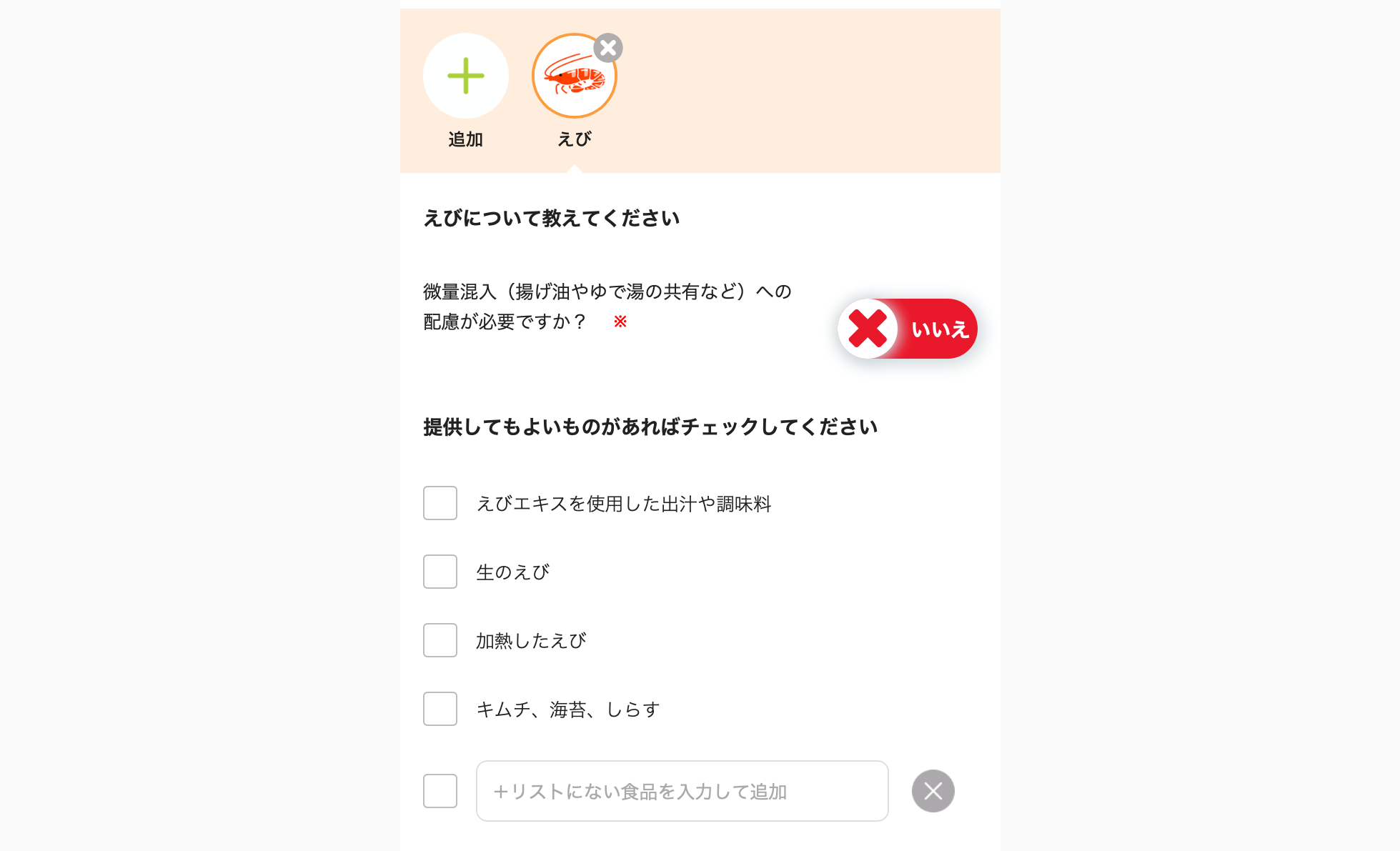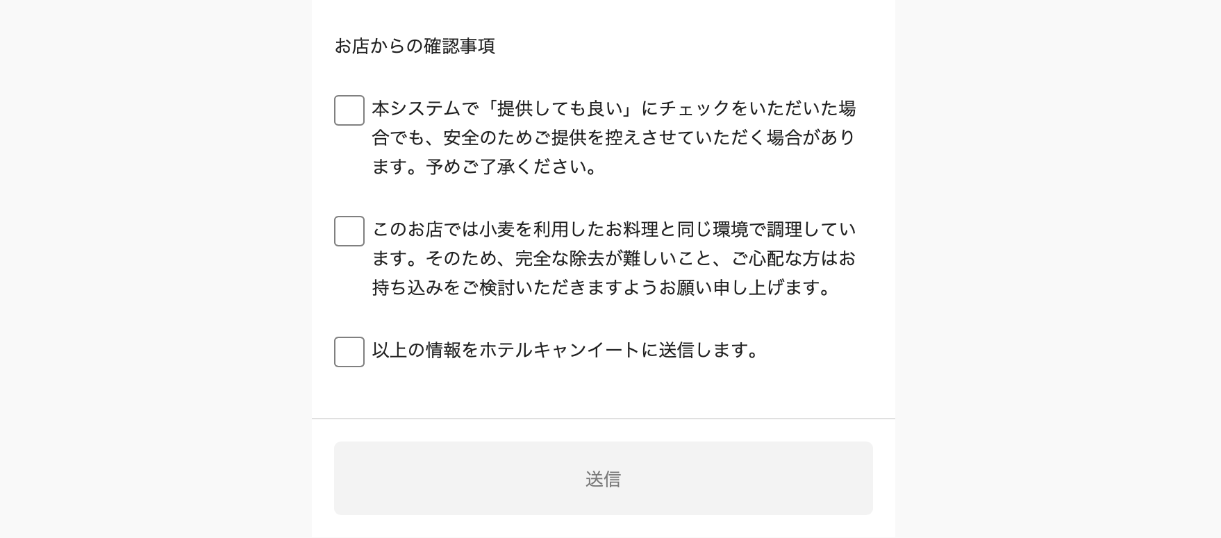 「食べられないもの」はもちろん、「提供してよいもの」の情報を集めることもできるため、代替食の提案にも活用可能。ゲストの申請画面に表示する確認事項や注意事項も自由に設定できるため、施設のキッチン事情に適した形でご利用いただけます。