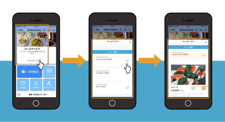 公共の場での飲食が制限されるため、お部屋内での飲食に視点を向けました。宿泊者は、お部屋の中客室内から、他のお客様と接触せずに、LINEを活用して料理やアルコールなどのドリンクの注文を行うことが可能となります。