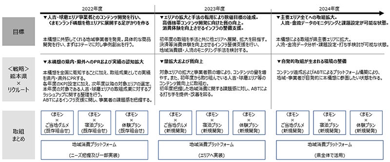 ①リクルートの旅行商品開発知見を提供し、地域内事業者の食・宿泊・現地体験プログラムの磨き上げおよび販売支援を行い、くまモンを冠した地域・旅行商品の造成、更なる認知度向上、売上拡大を図る。
