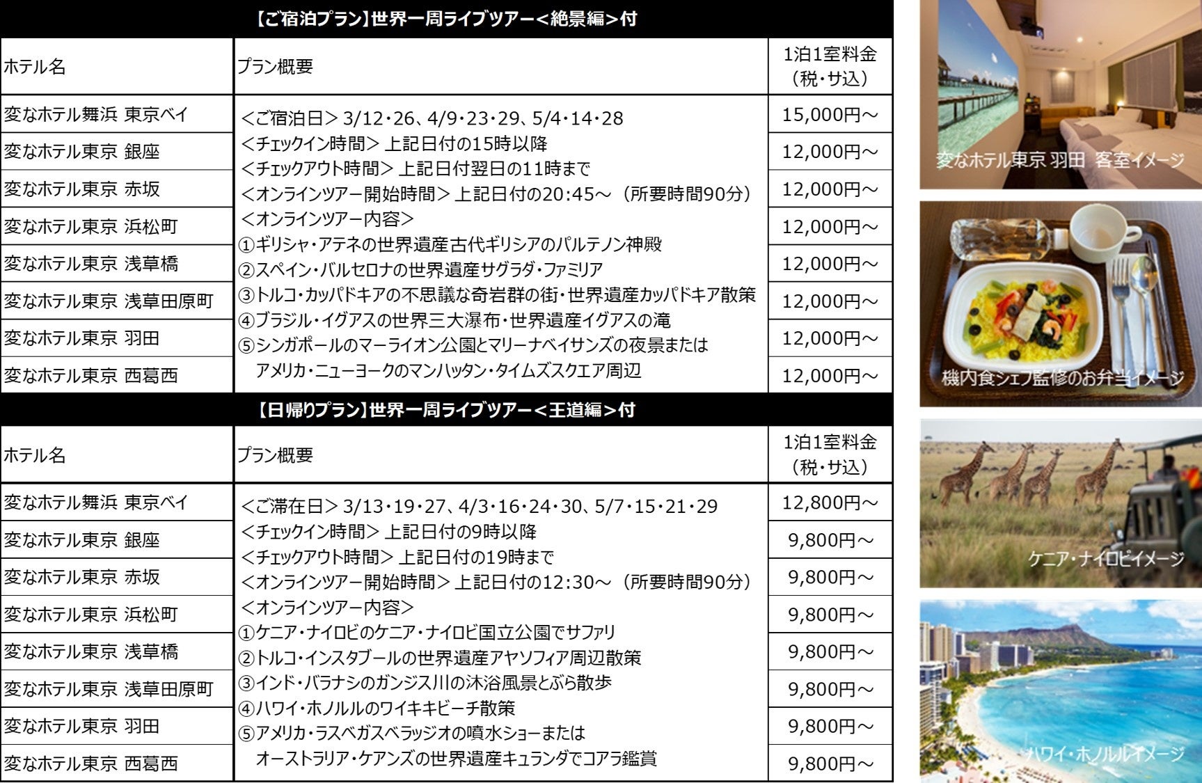 H.I.S.ホテルホールディングス株式会社(本社:東京都港区、以下HIS.H.H.)は株式会社エイチ・アイ・エス(本社:東京都港区、以下HIS)が展開する「オンライン体験ツアー」とコラボレーションし、変なホテルの客室で「世界一周旅行」疑似体験ができる“世界一周ライブツアー付プラン”を本日3月1日(火)より販売開始いたします。