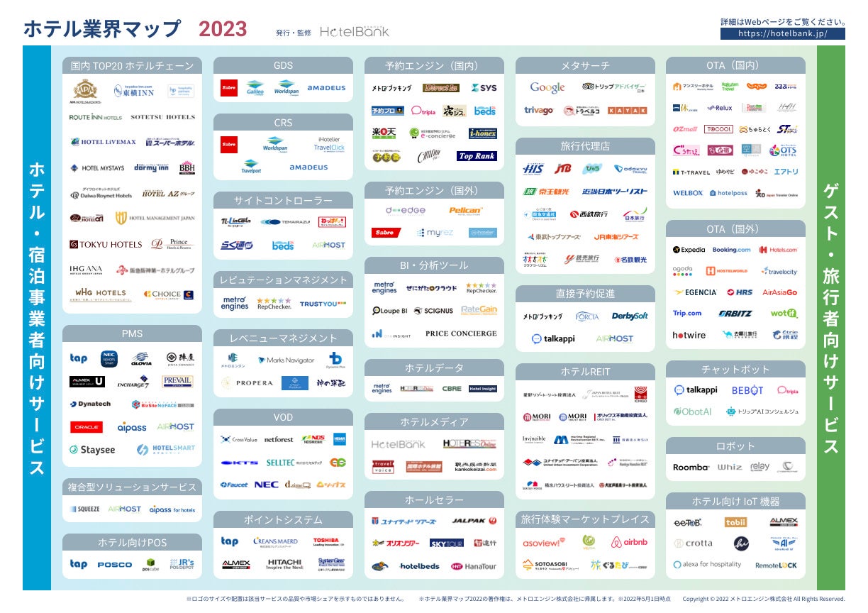 「眠っていたデータから新たな付加価値を」をコンセプトに、メトロエンジン株式会社が運営するホテル特化型メディア「HotelBank(ホテルバンク)」(https://hotelbank.jp)は、ホテル事業関係者、宿泊事業への新規参入を検討している方、ホテルや旅館などの宿泊施設に興味がある方々に向けて、ホテル市場の各分野で実績がある企業・サービスをピックアップしてマッピングした「ホテル業界マップ 2023」を公表しています。