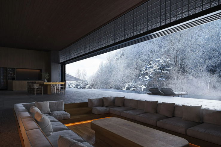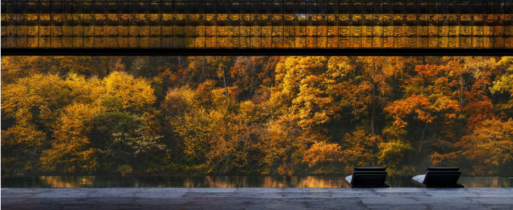 複数のスイートルームで構成されるもう1棟の建築は、ミニマルに研ぎ澄まされた空間が、四季折々に移り変わる景色を美しく引き立てます。
