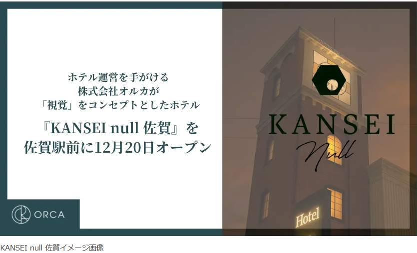 株式会社オルカ(本社:東京都渋谷区/代表取締役:金古政利)は、宿泊施設の開発・運営を手がけておりWellbeingなホテルブランドKANSEIとして“視覚”をテーマにした無人ホテル「KANSEI null 佐賀(カンセイ ヌル サガ)」が2025年12月、佐賀駅前にオープンいたします。