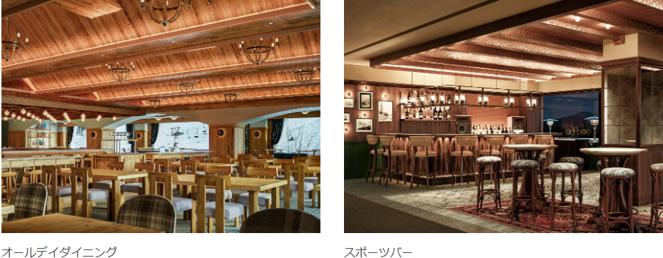 ホテルのメインダイニングはホテルゲストだけでなく、外来のゲストにも楽しんでいただけるオールデイダイニングをご用意いたします。ランチにはマウンテンリゾートらしいカレーや洋食、ディナータイムには炭火焼きのステーキが中心のグリルレストランを予定しております。また、ダイニングとは別に仲間内で楽しく杯を交わすことのできる広々としたスポーツバーも開設いたします。