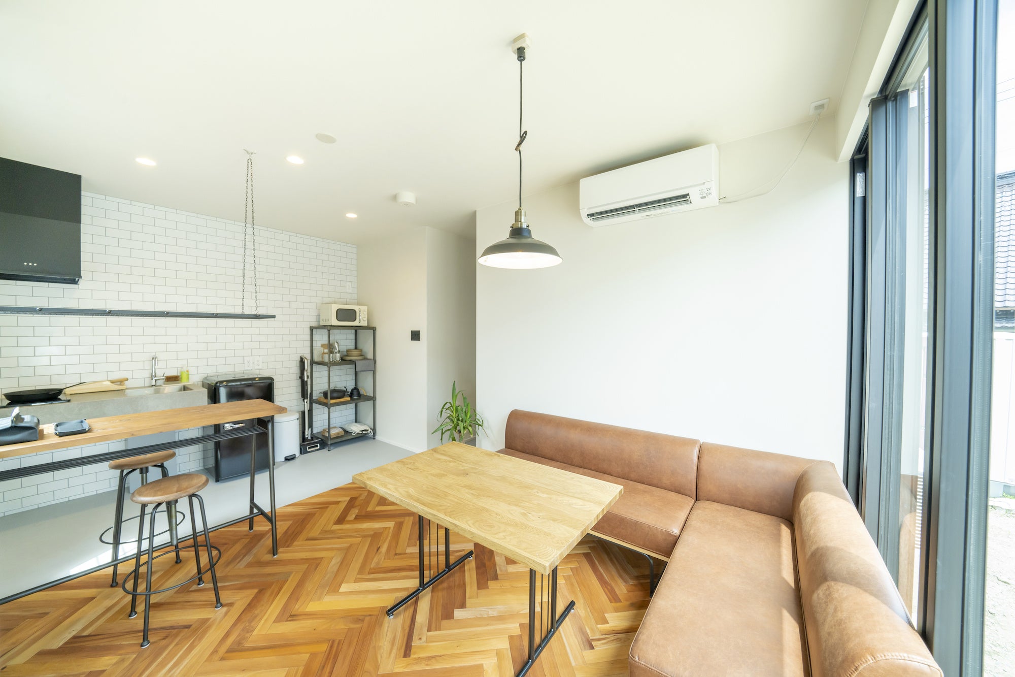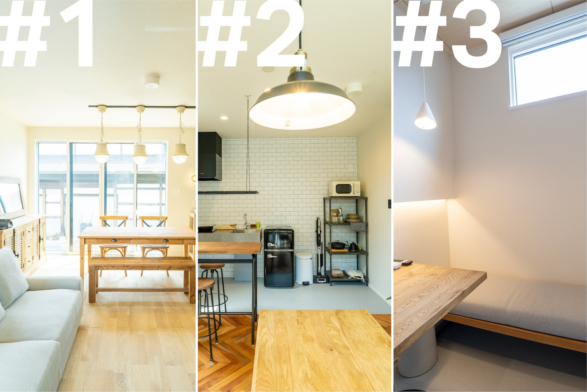 raw_は家具・生活用品にもこだわりました。ROOM #1には、一つ一つ違った印象を見せる古材のアイテムを多く取り入れました。ヴィンテージ感のあるソファや抜け感のあるチェアを使い、開放的でカジュアルな空間に。ROOM #2はスタイリッシュな印象になるように、アイアン家具で揃えました。細身のフレームが空間を広く見せ、2名様用ながらゆったりご利用いただけます。ROOM #3は一番小さなお部屋だからこそ、温かみと居心地のよさを感じられるよう、シンプルな木製家具を選びました。インテリアデザイナーによる、すべてのアイテムに意味のあるセレクトです。