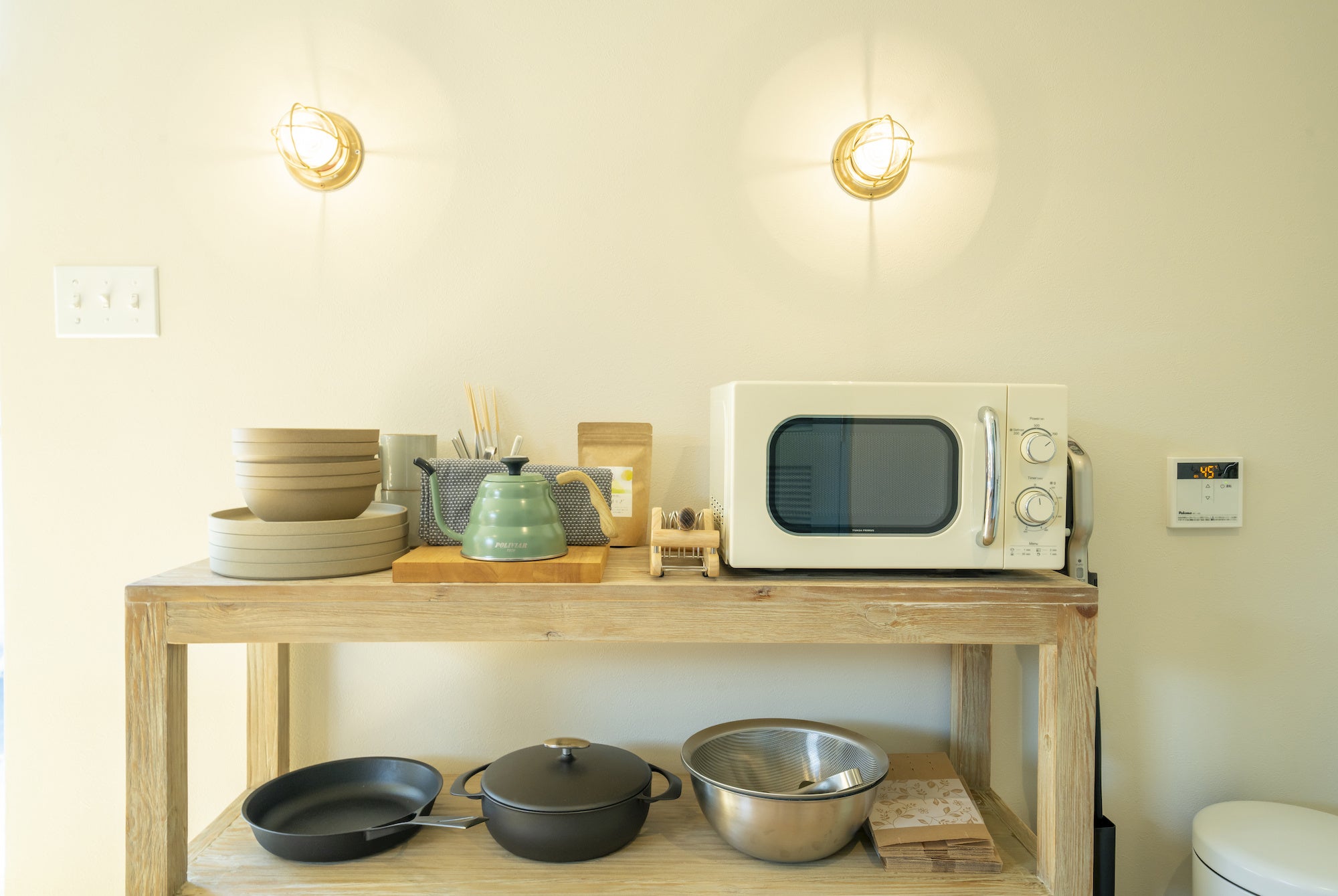 ベッドルームはKingとDoubeの2部屋、電子レンジや冷蔵庫のあるキッチンも備え、ミニマルながら自宅のように快適にお過ごしいただけます。室内にシャワールーム、2Fのルーフトップテラスにはバスタブを備えています。