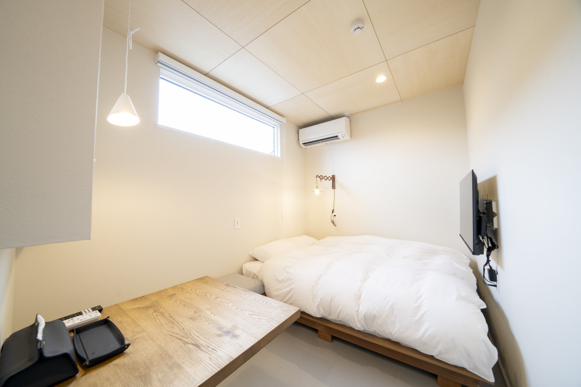 いらないを削ぎ落とした、ミニマルなお部屋です。機能性とリーズナブルさを求め、遊びに重きを置く方にぴったり。1〜2名でご利用いただけます。この部屋にだけ最高品質のDoubleサイズベットを導入し、コンパクトながら上質な体験を提供します。テレワークにも最適な作りとなっており、快適なリゾートワーケーションをお約束いたします。