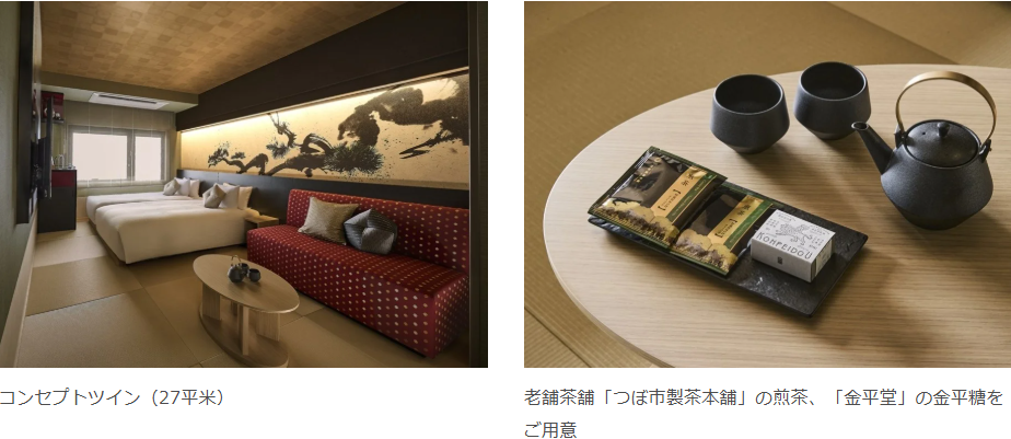 和の趣と洋の快適さを融合した畳敷きの和洋室。ホテル最上階、大浴場と同フロアにあり、湯上りもそのままくつろげます。水墨画家 與座 巧 氏が手掛けた“長寿の象徴”とされる「松」のアートが、心地よい和の雰囲気を演出します。