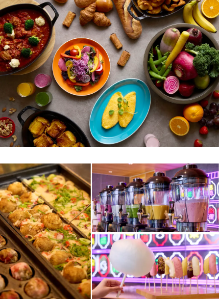 「カーニバルキッチン」をコンセプトに、大阪らしいユーモア溢れるビュッフェをご用意。和洋の王道メニューに加え、オープンキッチンを使った“洋風たこ焼き”などの定番大阪アレンジ料理、フレッシュフルーツやミックスジュース、綿あめ、チョコバナナなどお祭りをイメージしたラインアップが一日の始まりを彩ります。