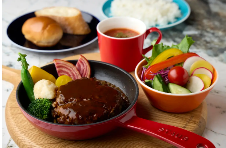 ご注文ごとに一つひとつ丁寧に手ごねし鉄板で焼きあげたハンバーグと、サラダビュッフェなどのセットをお楽しみいただけます。