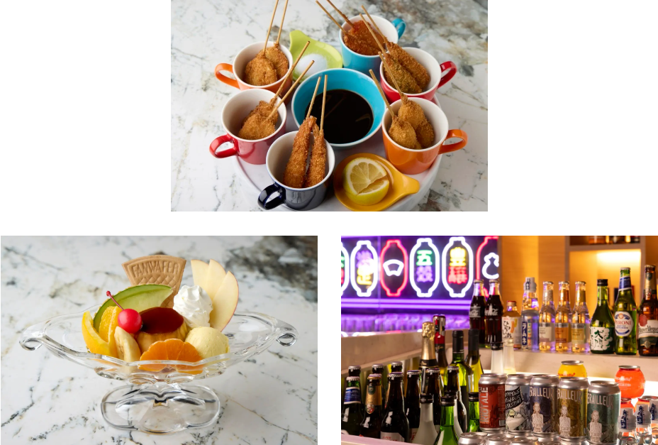 夜になると、パブとして表情を変え、はらわた ちゅん子 氏が手掛けるネオン輝く空間で、「串カツ」や、「プリンアラモード」など、ローカルフードをアレンジした料理やスイーツなどが登場。ドリンクは、大阪市西成区のビール醸造所「Derailleur Brew Works(ディレイラ ブリュー ワークス)」の”西成ライオットエール”をはじめ、オリジナルカクテル等、約 50種以上を提供します。