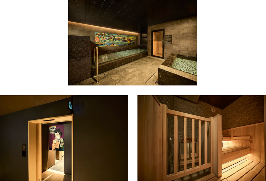 ホテル最上階の大浴場にはサウナルームも完備。鈴木 ひょっとこ 氏による壁面のアートに風情を感じながら、併設する湯上り処とともに旅の疲れを癒すことのできる空間です。