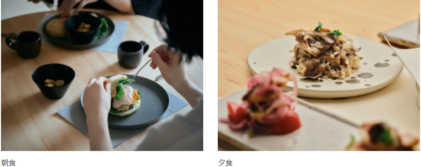 お食事は、地元の創作フレンチ〈MarPe〉の谷橋シェフが監修する特別メニューをご用意。福井県で採れた食材を最大限に活かしながら、越前和紙や工芸の世界観に触れられるお食事をお楽しみいただけます。夕食のメイン料理は、越前和紙を用いた奉書包焼き。SUKUオリジナルの越前漆器や越前焼など、産地ならではのテーブルウェアを使った設えもお楽しみいただけます。また、近隣のローカルなお食事処もご紹介できますので、滞在スタイルに合わせてお選びください。体験