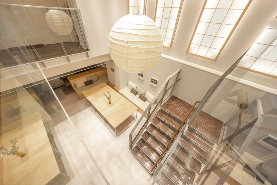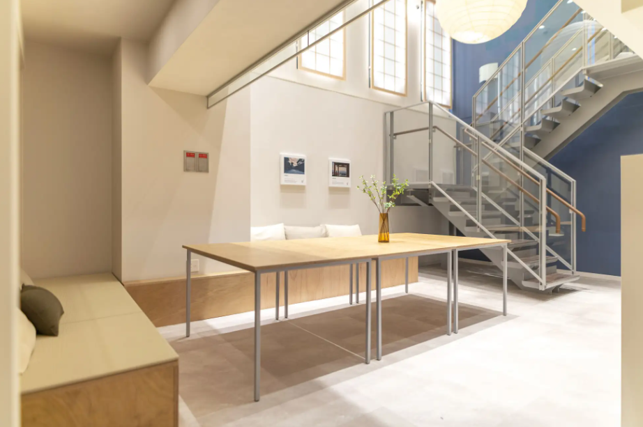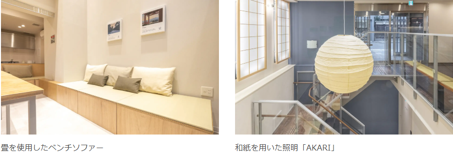 本施設のラウンジは、到着してから出発まで、宿泊利用者が24時間自由に使えるスペースです。電子レンジ、IHキッチンコンロを完備したシェアキッチンや、大きなダイニングテーブルが滞在の質を高め、「暮らすように泊まる」滞在体験を実現します。畳を使用したベンチソファーや、和紙を用いた照明「AKARI」が、京都の醸し出す和を表現しています。
