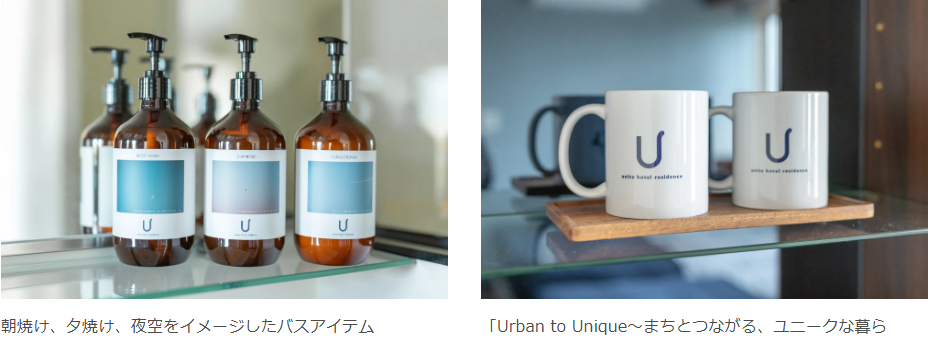 当社は、全国に8棟340室(2025年12月現在)を展開する「unito hotel residence」のブランド強化に取り組んでいます。「Urban to Unique〜まちとつながる、ユニークな暮らし〜」をイメージしたロゴを基調に、看板、ネイバーマップ、アメニティなどのオリジナグッズを新たに設置するなど、unitoの世界観を反映したブランド体験を追求しています。2023年7月に「ホテルレジデンス大橋会館 by Re-rent Residence 」、2024年10月に「Hotel Residence unito NAMBA Motomachi」、2025年4月に「Hotel Residence ASAKUSA by unito」が新規開業しました。
