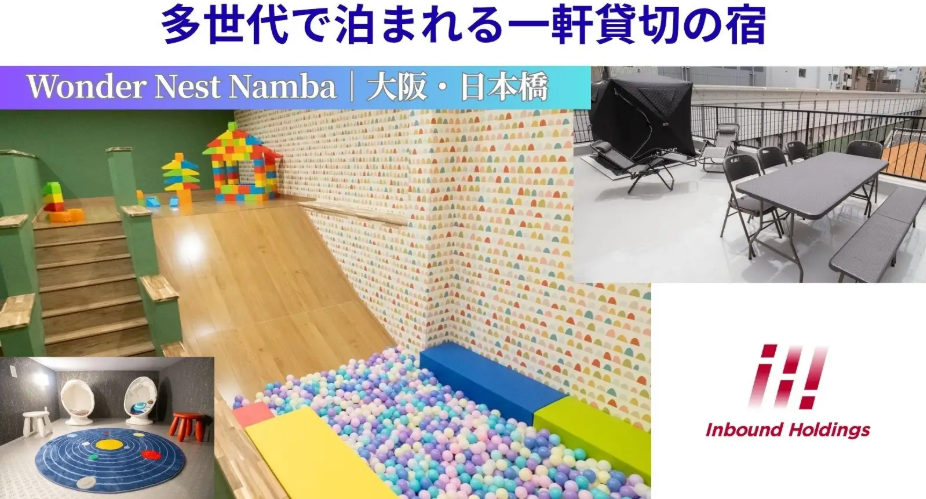 訪日観光客向けサービスやホテルや民泊の管理・運営などを手掛ける株式会社インバウンドホールディングス(本社:大阪市西区、代表:坂本 正樹)は、大阪の難波・日本橋エリアにある築60年の空き家をリノベーションし、子どもから大人まで多世代で楽しめる1棟貸し宿「Wonder Nest Namba(ワンダー ネスト ナンバ)」の運用を開始します。