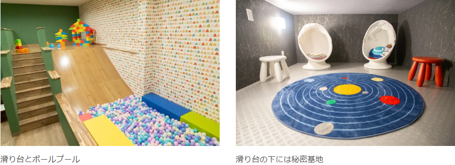 1階全体がお子さま向けのプレイエリアになっています。滑り台・ボールプール・トランポリンなどの遊具を設置し、子どもたちは安全かつ自由に遊べるエリアです。お天気を気にせず、一日中楽しく遊べます。