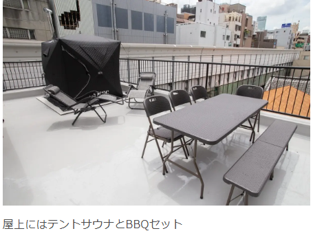 屋上には解放感あふれるテントサウナを設置。大阪ミナミの空を眺めながら、非日常の癒し時間を提供します。BBQセットも設置しており、都会の真ん中で家族やグループでのアウトドア気分を満喫できます。