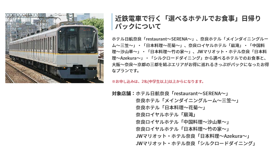 近鉄電車で行く「選べるホテルでお食事」日帰りパックについて