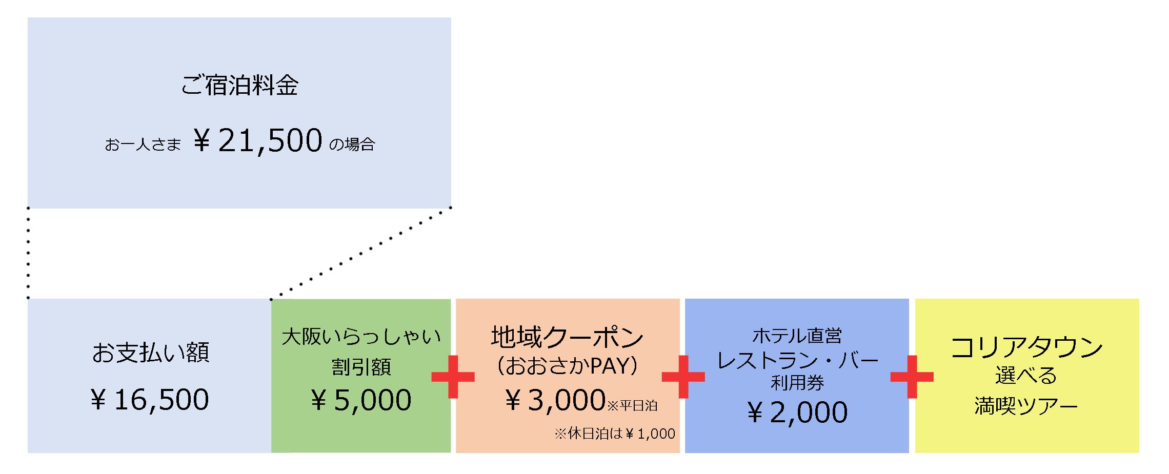 https://www.newotani.co.jp/osaka/stay/plan/osakairasshai/ホテルニューオータニ大阪は、2022年10月11日(木)から12月20日(火)までの期間、全国旅行支援「日本中から大阪いらっしゃいキャンペーン2022」対象プランとして、①宿泊料金最大¥5,000割引、②「おおさかPAY」クーポン最大¥3,000分付与、③2,000分の「ホテルミールクーポン」が付与されるのに加え、鶴橋・大阪コリアタウンでお愉しみいただける「選べる満喫ツアー」が付いた宿泊プラン『日本中から大阪いらっしゃい2022~鶴橋・大阪コリアタウン選べる満喫ツアー~』を販売いたします。