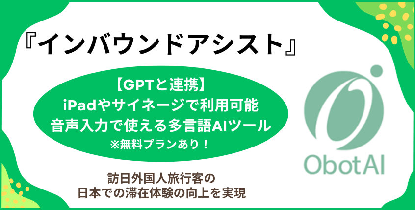 株式会社ObotAI(東京都港区、代表取締役社長:北見 好拡)は、インバウンド事業を行っている企業に向けて、訪日外国人旅行客とのコミュニケーションを円滑にし、日本の文化や地域情報を提供できる、ChatGPTを組み込んだAIチャットボットサービス「インバウンドアシスト」の提供を開始することをお知らせいたします。
