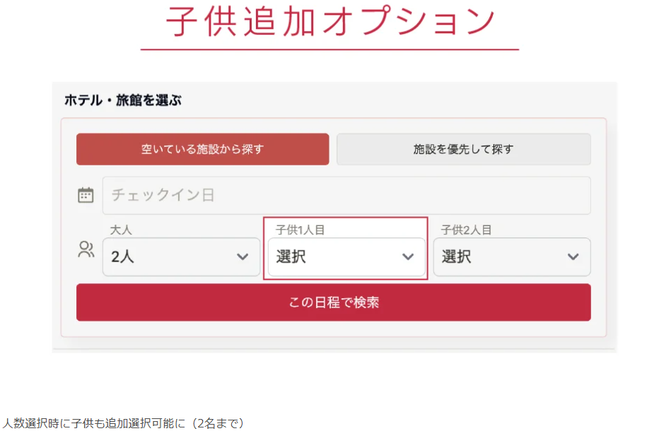 これまでのペア宿泊ギフトでは、受け取った側が子ども同伴で使いたい場合には、施設への事前確認や個別対応が必要でした。今回、既存のペア宿泊カタログ全商品に子ども追加オプションを実装。受け取った後、予約画面で年齢・人数を入力すれば子ども料金が反映され、そのまま予約を確定できます。出産祝いの内祝い、記念日の贈り物、祖父母から子育て中の家族へのギフトなど、全ての宿泊カタログがより幅広いギフトシーンに対応します。