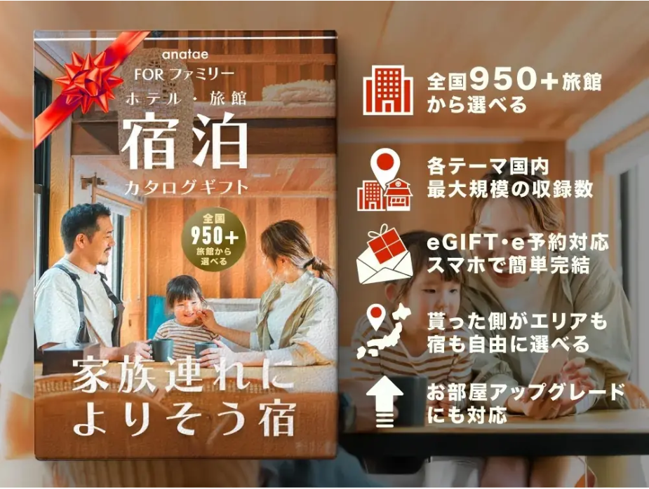 あわせて、家族連れにやさしいホテル・旅館を厳選した「【家族連れによりそう宿】ファミリー宿泊カタログギフト」の販売を開始しました。子連れ宿泊に必要な設備やサービスが整った施設を多数収録し、家族の予定や好みに合わせて宿と日程を選べる、anataeの家族旅行ギフトの新定番です。■もっと自由に、もっと気軽に家族旅行を。家族旅行の計画しやすさに特化し機能拡充