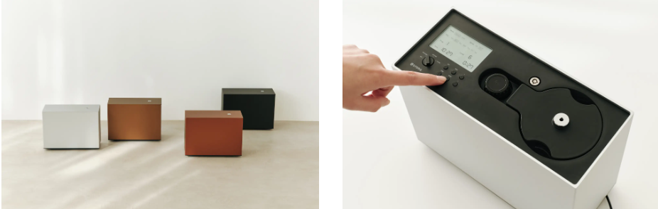 カラーは、ニュートラルな4色展開。潔いスクエアフォルムと、家具のように空間になじむ質感が、家電的ではない上質感を生み出します。機能面は、曜日ごとに最大3つのプログラム(開始時刻・停止時刻・噴霧レベル)と、15段階のレベルから濃度調整が可能。使う人それぞれの過ごし方に合わせて、香りのある空間を心地よくしつらえることができます。100%天然のエッセンシャルオイル本来の香りが、空間を静かに満たします。
