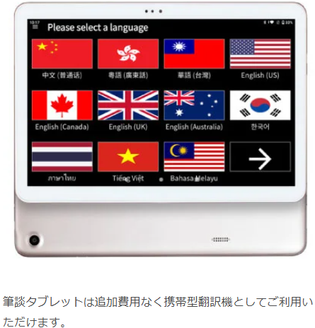 翻訳機とタブレットを連携することで、手書き入力した文字を各国言語へ翻訳できます。翻訳機能はタブレット最大5台まで同一料金でご利用可能です。受付だけでなく館内や店舗内など、持ち運んで利用することも可能です。なお、筆談タブレットはオプションとして39,800円(税別)で提供しております。筆談タブレットで翻訳機能をご利用いただいた場合でも、各プラン料金内でご利用いただけますので、別途翻訳費用は発生いたしません。