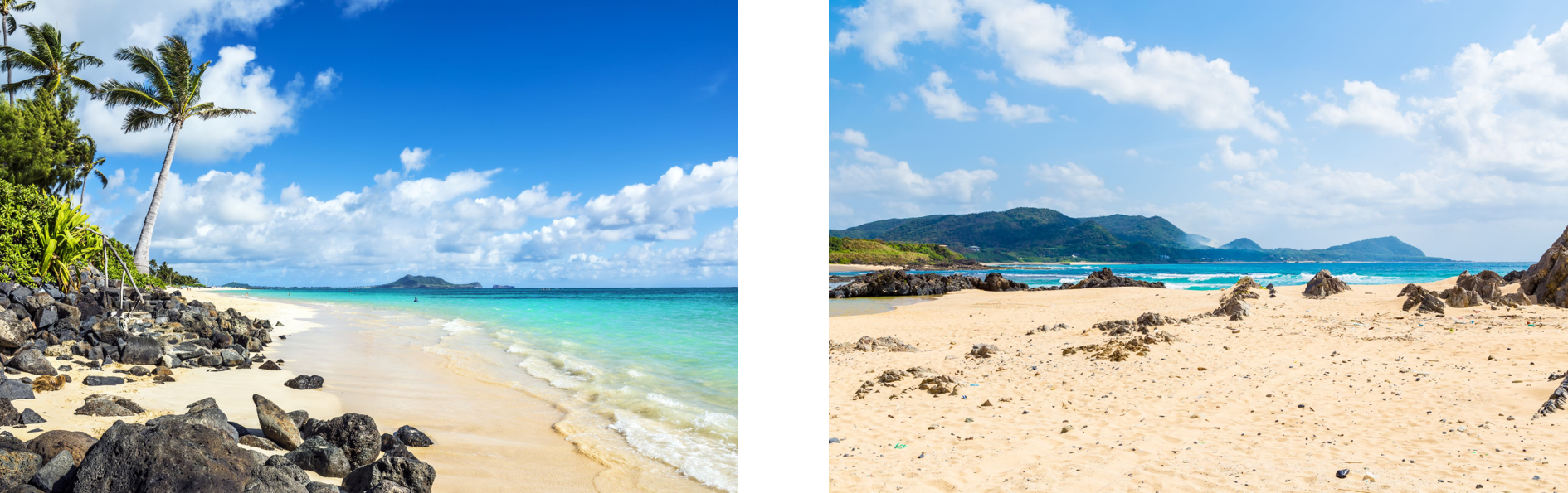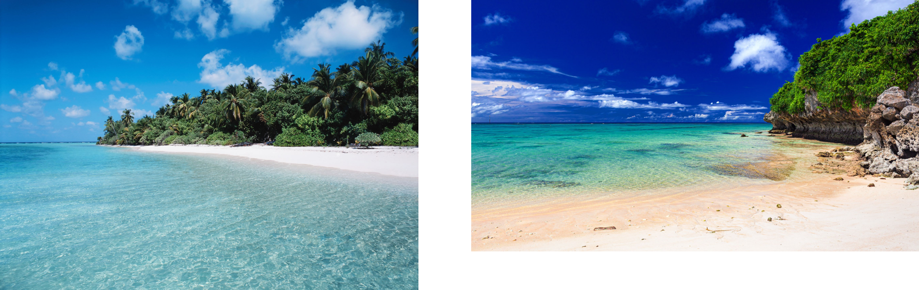 (左の写真 モルディブ、右の写真 鹿児島与論島)