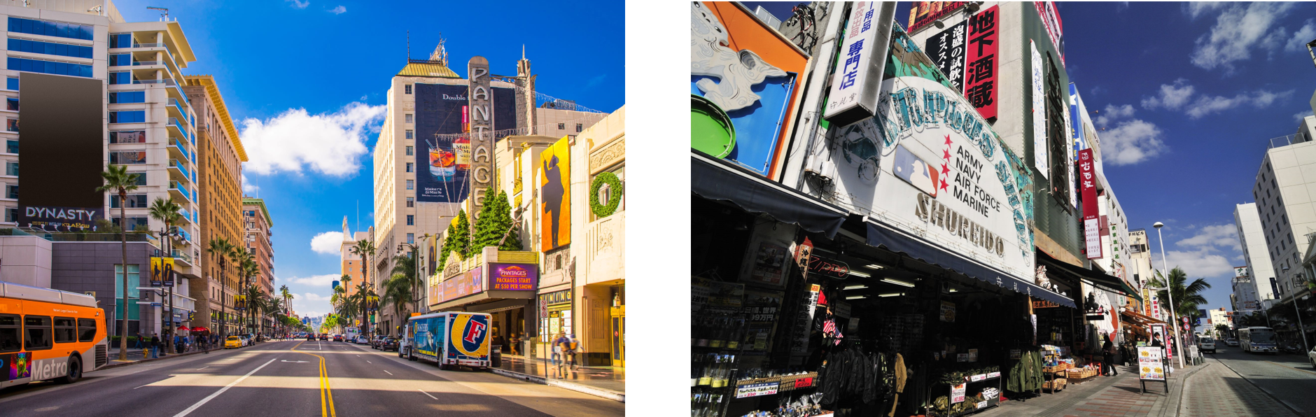 (左の写真 ロサンゼルス、右の写真 沖縄)