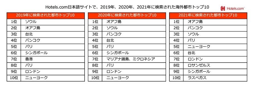 ※1最もHotels.com日本語サイト内で検索された海外の旅行先のランキング: Hotels.com上で2019年(2019年1月~12月)、2020年(2020年1月~12月)と2021年(2021年1月~12月)のサイト訪問者数をもとに算出しています。
