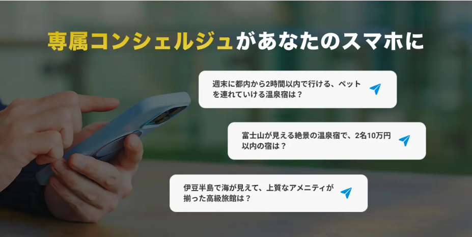 「週末に都内から2時間以内でいける、ペットを連れていける温泉宿は?」「東京から車で2時間以内でいける、サウナと温泉がある高級旅館は?」など、複雑で曖昧なリクエストも、まるであなたの専属コンシェルジュに話かけるように会話形式で簡単に探せます。