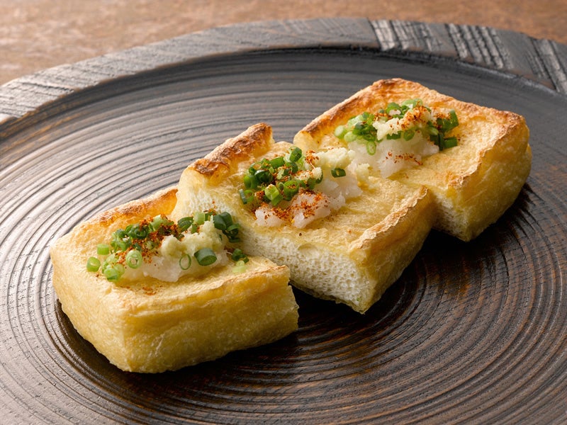 200年以上の歴史があり、一般的な油揚げより厚みと弾力のある栃尾のあぶらげ(油揚げ)。そのおいしさの秘密は「にがりを入れるタイミング」と「二度揚げ」。芯までふっくらと揚がったあぶらげをシンプルに焼き上げました。