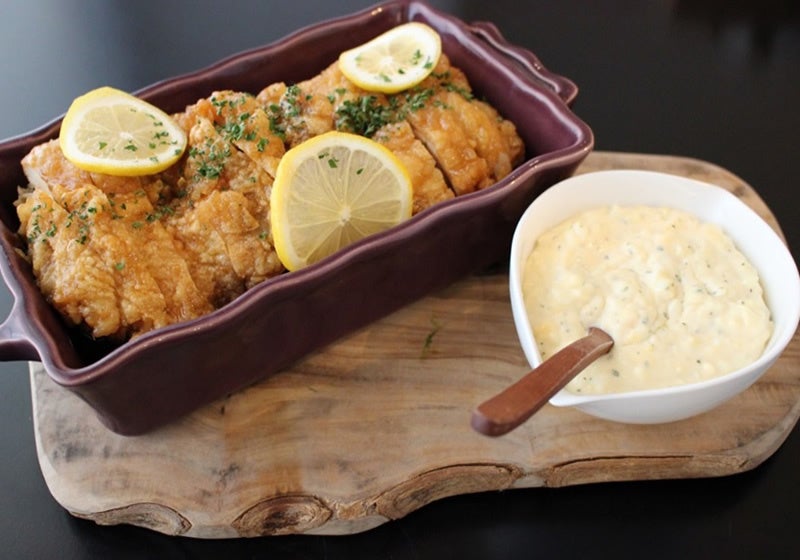 宮崎県が発祥のチキン南蛮。鶏肉に卵をからめて揚げるのが特徴です。自家製のタルタルソースを添えてご用意しました。南蛮酢にはレモンを入れて、さっぱりと仕上げました。。