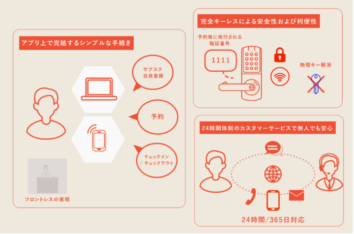 従来の無人宿泊施設では、フロントに設置された機器にゲストが情報を入力し、暗証番号を取得するなどの方法が主流でしたが、SANU 2nd Homeではフロント自体が存在せず、サブスク会員登録、予約、チェックイン/チェックアウトといった滞在までに必要なすべての手続きをサブスク会員自身のスマートフォンのアプリ上で完結します。また、suitebookで客室の稼働状況や滞在者情報が一覧で管理されるため、宿泊前後・滞在中を問わず、サブスク会員がいつでも・どこでもカスタマーサービスを受けられる環境が整備されています。