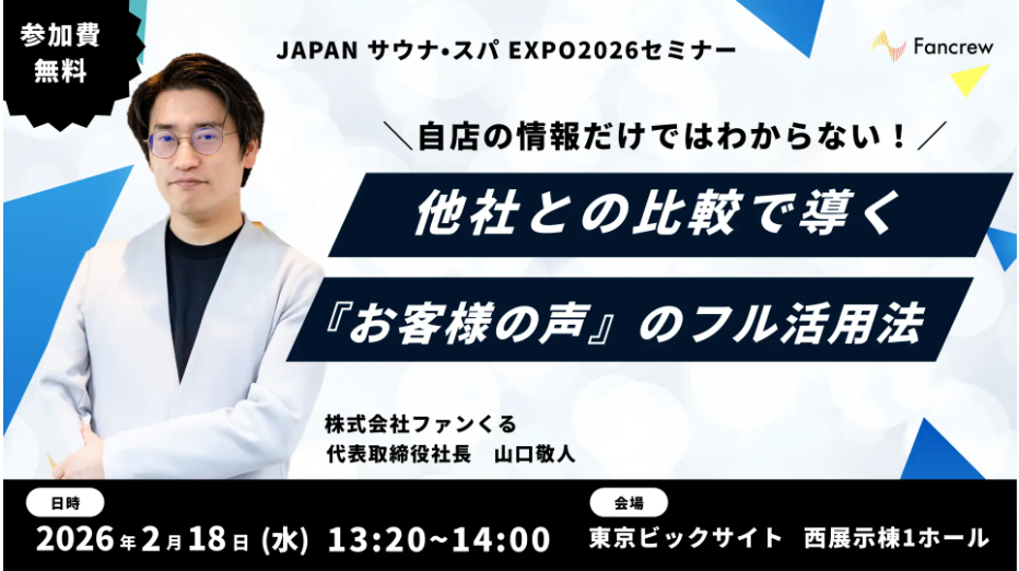「JAPAN サウナ・スパ EXPO2026」は、サウナや温泉、温浴施設等、温浴業界に特化した最先端技術や製品・サービスなどが集結し、数多くのビジネスチャンスが創出される温浴業界最大の展示会です。本展示会会場の2月18日(水)13:20~14:00にて、「自店の情報だけではわからない!他社との比較で導く『お客様の声』のフル活用法」と題して実施されます。